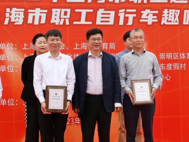 上海市職工文體協會會長陳必華為崇明生態旅游集團、陳家鎮總工會頒發“賽事貢獻獎”