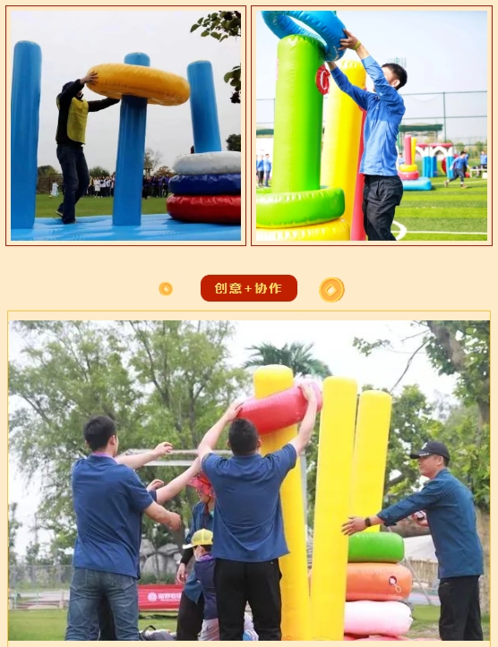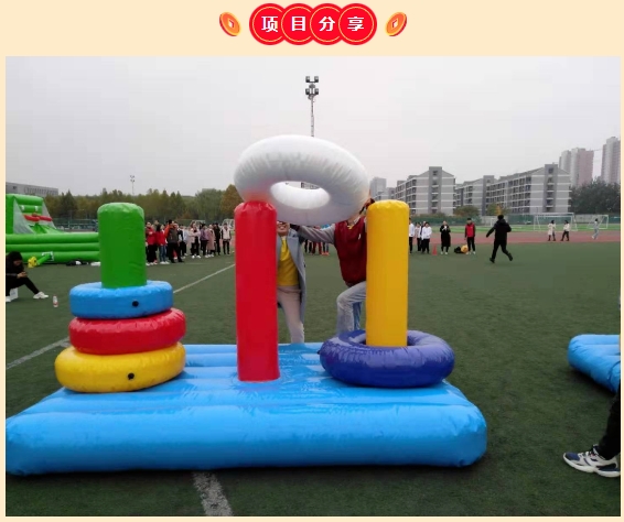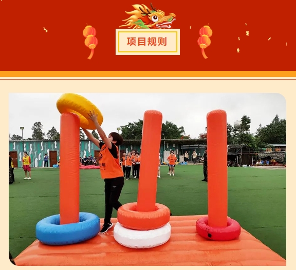 游戲規則:每隊選派相當人數參與比賽,不限男女。場地上共有三根充氣柱子,第一根柱子從上往下套著由小到大四種尺寸的氣圈。參賽選手依次上場,輪流操作,任務是把所有的圈移動到其他任意一條柱子上,但此過程中必須遵循“大圈在下,小圈在上”的規則。越快完成任務的團隊排名越靠前。