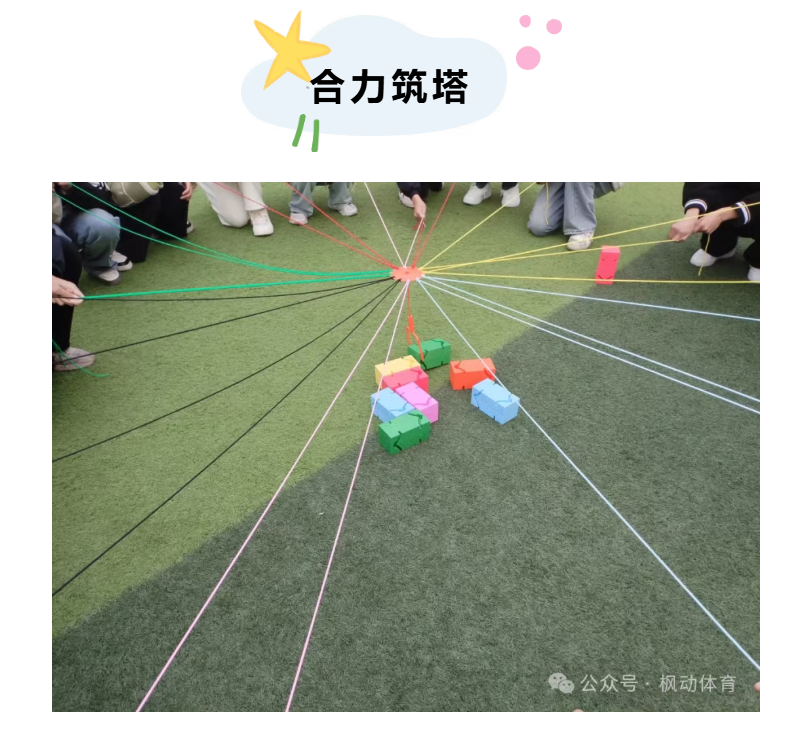 活動玩法:根據人數在塔鉤處系上足夠數量的繩索,在所有人的控制下一起吊起相應的版塊,并摞起來就能獲勝啦