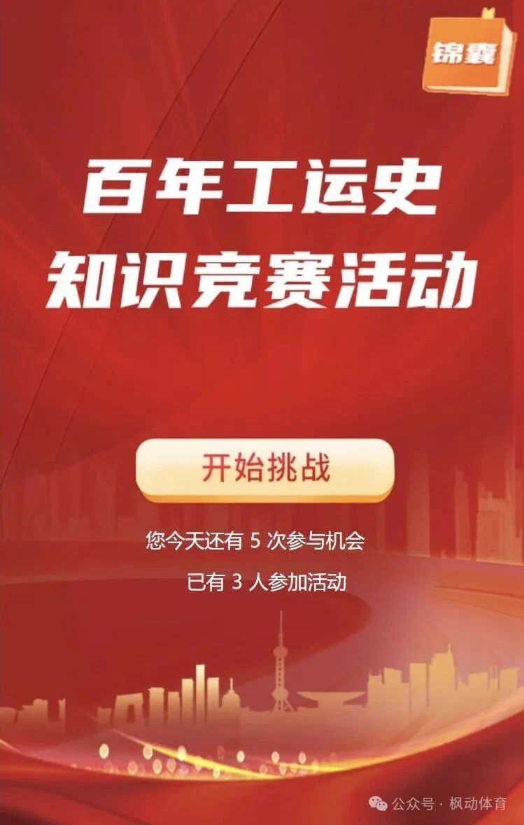 為慶祝中華全國總工會、上海總工會成立100周年,進一步推動市總機關系統干部職工深入學習工運史,激發廣大干部職工立足崗位、勇擔使命,為上海工會事業發展添磚加瓦的干事熱情。結合上海工會實際,楓動體育為市總機關系統干部職工中開展百年工運史知識競賽活動,在答題中感悟工運精神,凝聚奮進力量!