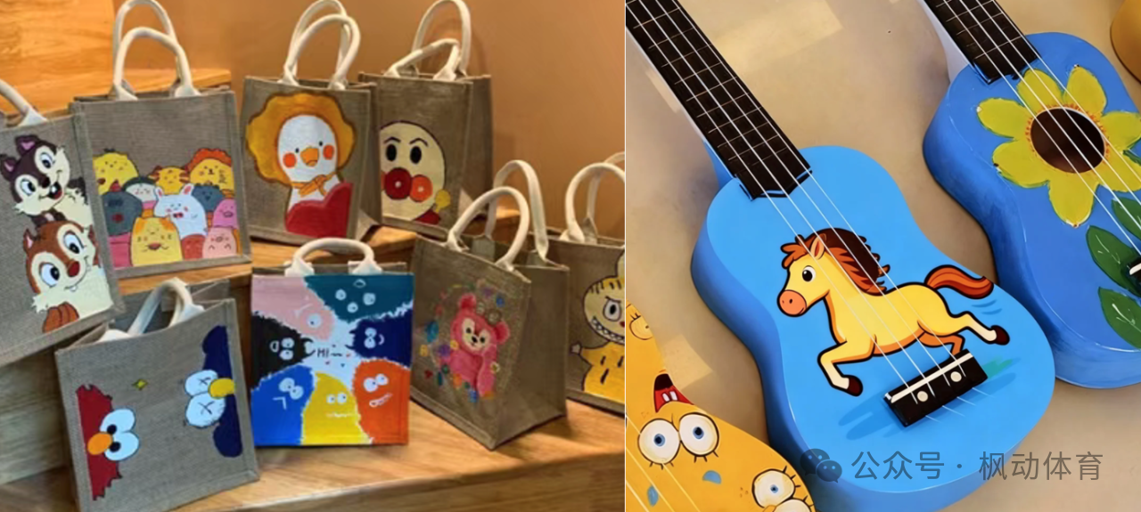 讓普通黃麻包變成逛街神器——手繪黃麻包;在琴面繪制海浪、陽光,點綴海龜、椰樹等元素,營造熱帶風情與音樂情調——尤克里里;選用明快色彩描繪音符、節奏感符號,結合動感線條,展現音樂的魅力與節奏感——拇指琴:
