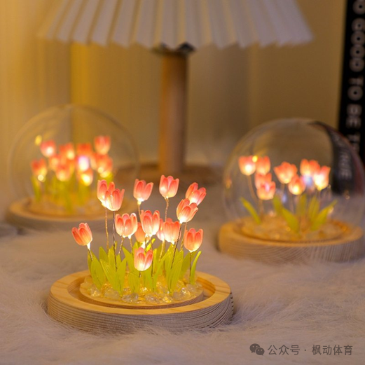 郁金香花束小夜燈是一種結合了鮮花裝飾與照明功能的創意禮品,常作為溫馨的家居擺件或浪漫禮物。它通常以仿真郁金香花束為造型,內置LED燈源,點亮后能營造柔和的氛圍光,適合放在床頭、桌面等地方。